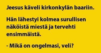 Jeesus tulee baariin ja ottaa homman haltuun. Surkean näköiset miehet muuttuvat hetkessä iloisiksi ja alkavat...