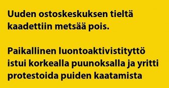 Luontoaktivisti saa kokea puissa kiipeilyn nurjan puolen, eikä kipua saada lievennettyä ihan tuossa tuokiossa....