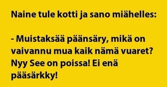 Voi tätä ilon ja onnen päivää. Vaimon päänsärky on poissa. Erikoisemmat keinot ja kikat on otettu käyttöön ja mies...