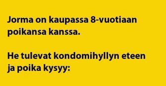 Kondomipakkauksissa on eroja ja sekös pientä poikaa askarruttaa. Onneksi isällä on tietoa.