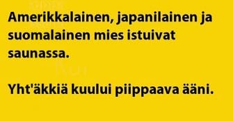 Suomalainen, amerikkalainen ja japanilainen vertailevat saunassa istuessaan erikoiskykyjään. Suomalaisen pätemishätä ei...