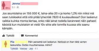 Jennan pitäisi suosiolla jättää omat laskelmat väliin ja luottaa laskureihin tai pankkiin.