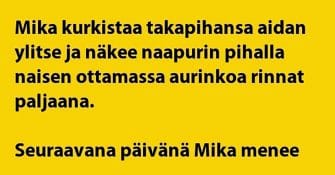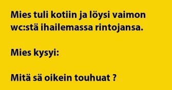 Vaimolla on vessassa oma projekti päällä ja kun mies pelmahtaa paikalle, niin uteliaisuus herää. Mitä se vaimo oikein...