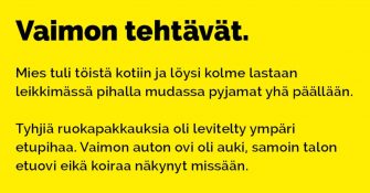 Tänään asiat eivät ole totutulla mallilla kotipuolessa. Kun mies saapuu töistä kotiin, niin hän kohtaa järkyttävän näyn.