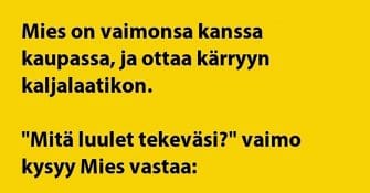 Mies ja nainen ovat ostoksilla ja kärryyn ammennetaan milloin mitäkin. Kun tulee kaljan vuoro, niin saman tien on...