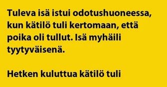 Isän odotusaika on odotushuoneessa pitkä, eikä se yhtään lyhene, kun kätilö tulee kertomaan uutisia, kerta toisensa...