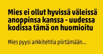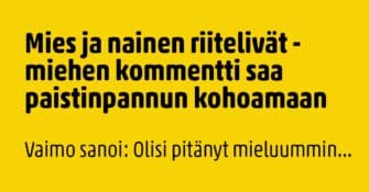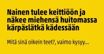 Kun nainen tulee keittiöön, niin siellä on hulina ja vilinä päällä. Mies huitoo ja läiskii menemään oikein tosissaan....
