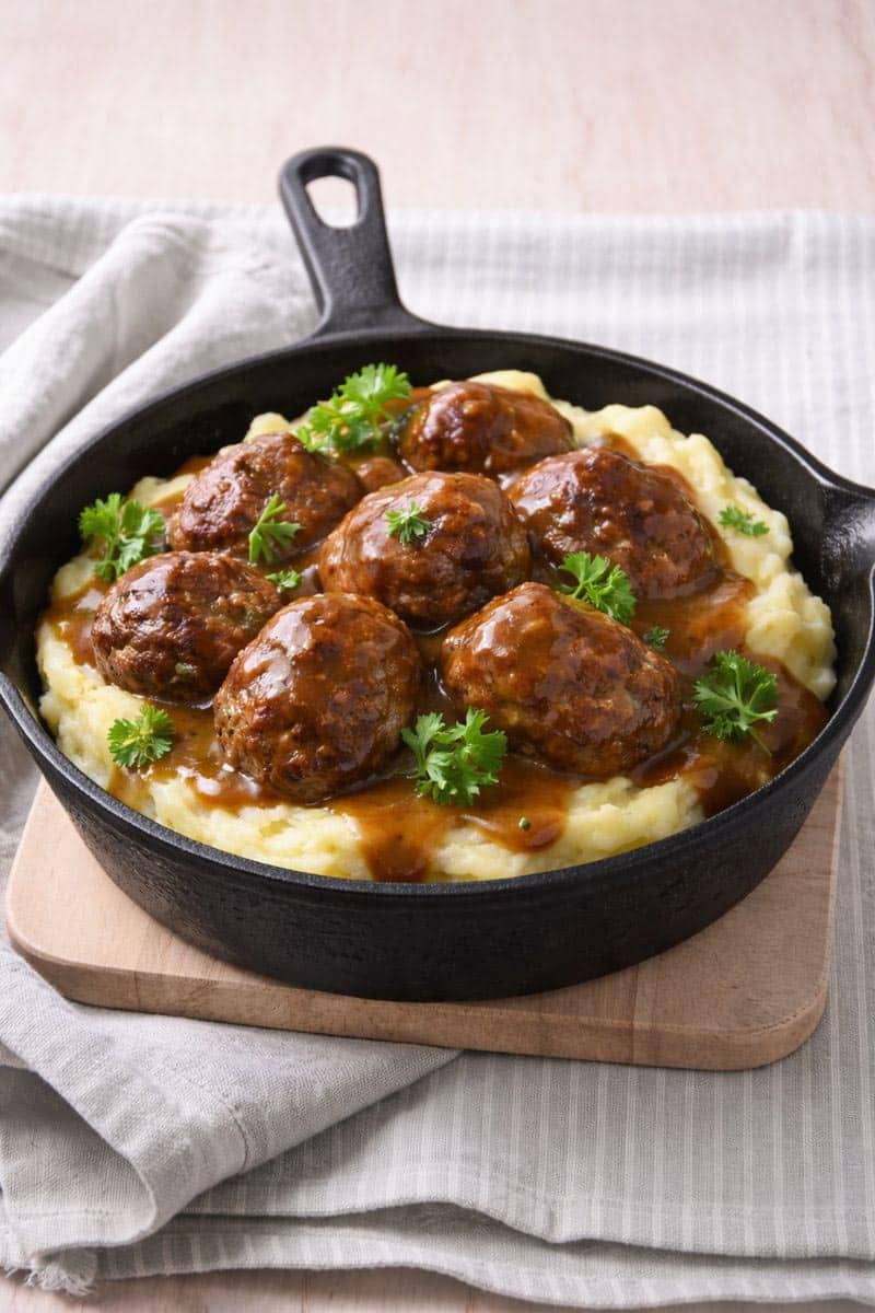 Tarjoile lihapullat ja kastike perunamuusin kanssa.